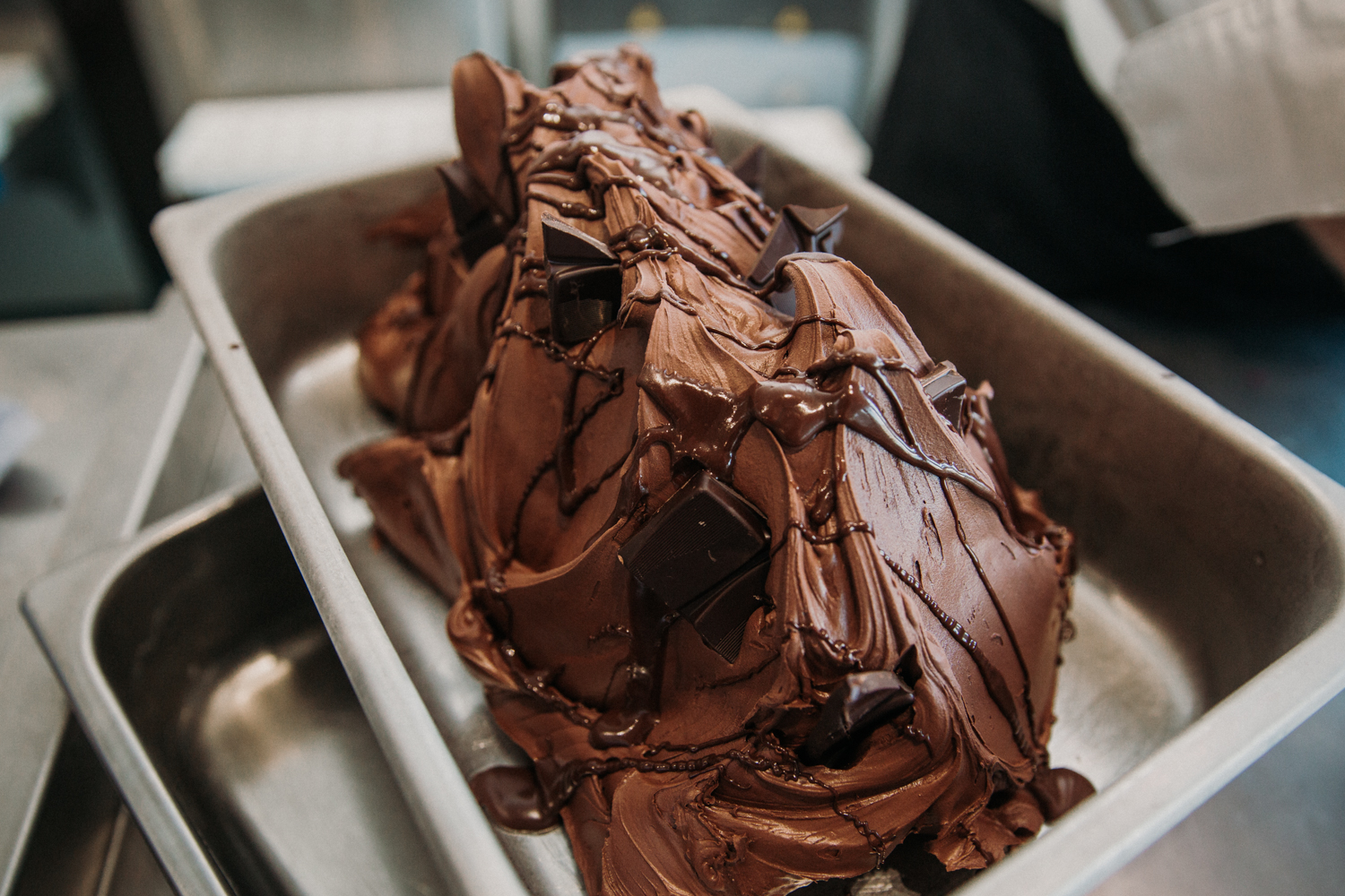 Why do we use these two ingredients? Well, we opt for chocolate pieces to achieve the body, texture and mouth feel, whilst the cocoa powder is used for depth of flavour, as well as sharpness (with a hint of bitterness) on the palette.